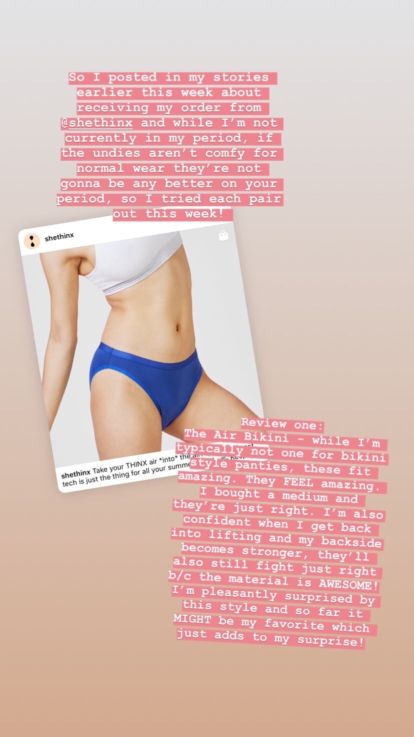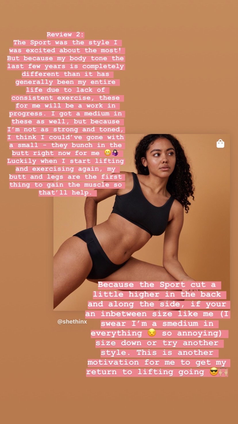 Now, there are a number of different products and brands (though not as many as there should be honestly), so I made my decision based on three things: fabric, style options and price. There were other factors including feedback as well as the company's mission, but I mainly needed a product that fit me, was comfortable and wouldn't break the bank. With all that I was confident in purchasing three different styles of period panties from SheThinx. I ordered them during my second period in September after I had it with regular pads, but the arrived after my period was done. Let's not forget though that they are at their core panties, so I took them for a test run because if I don't like them when I'm not on my period, there's a good chance I won't like them during my period. Luckily the test run went well and I posted about it in my Instagram stories (which I've included in this post). I received a lot of feedback from friends curious about them, which is part of the reason why I decided to dedicate a majority of a blog post to them!